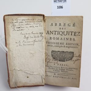 ABREGE DES ANTIQUITES ROMAINES , édition Jean Luc Nyon , Paris ,1725, in-12 Reliure en veau d’époque , dos lisse orné de dorure. Les tranches sont rouges. Mors frottés.