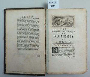 AMOURS DE DAPHNIS ET CHLOE , Amsterdam, 1750 Ouvrage orné d’un frontispice , de 6 vignettes et 7 gravures d’un élève de Picart. Reliure rigide marron en mauvais état. Les mors sont complètement déchiré et le dos en mauvais état. ...