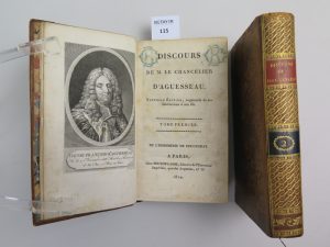 CHANCELIER D’AGUESSEAU , Discours , édition Brunot-Labbe , 1810 , in-12 2 tomes. Contient un frontispice représentant l’auteur dans le premier tome. Nombreuses rousseurs. Reliure rigide en veau d’époque, dos lisse , pièce de titre en rouge...