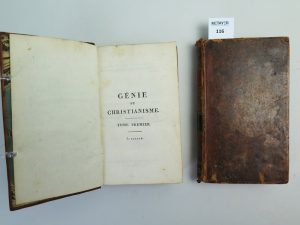 CHATEAUBRIAND , Génie du christiannisme ou beauté de la religion chrétienne , édition Beaucé Rusand , Paris , 1818 , in-12 2 tomes. Reliure plein veau. Les mors du tome 1 sont frottés. Pièce de titre et tomaison en noir. ...