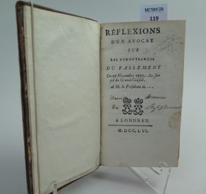 COMMARTIN L’ABBE , Réflexions d’un avocat sur les remontrances du parlement , Londres , 1756 , in-12 Première édition condamnée à être brulée et sauvée de la destruction. Reliure en veau marbré , tranches rouges , dos à 5 nerfs ,...