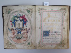 Emanant de l’université de Macerata (Italie méridionale) conférant le titre de docteur en théologie et en philosophie à Lucas Marrocchus. Manuscrit sur peau de vélin. 8 feuillets sous reliure de l’époque. Maroquin rouge entièrement orné de décors dorés , armes dorées au centre. Petit manque à un mors , petit trou de ver aux deux derniers feuillets.