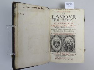 ESTAMPES Leonor de , Traité de l’amour de dieu du bienheureux François de Sale évêque et prince de Genève , édition Hure , 1647 , in-8 - Exemplaire réglé. Reliure plein cuir noir estampé d’époque , dos à 5 nerfs , un fermoir est...