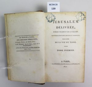 TASSE le, Jérusalem délivré, édition Bossange , 1817 , in-12 2 tomes en un volume. Nombreuses illustrations en noir. Reliure en veau d’époque , dos lisse orné de dorure. La pièce de titre en noir se détache. Le dos est frotté , la coiffe...