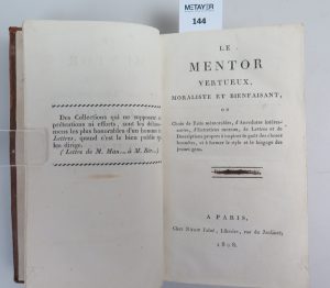 LE MENTOR VERTUEUX MORALISTE ET BIENFAISANT , édition Nyon , Paris , 1808 , in-12 Reliure veau d’époque en mauvais état. Pièce de titre décollée et insérée à l’intérieur , dos très abimé lisse et orné de fleurons dorés. Manque de...