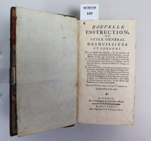 NOUVELLE INSTRUCTION OU STILE GENERALE DES HUISSIERS ET SERGENS , par la compagnie des libraires associés , Paris , 1776 , in-12 Pour dresser tout exploits , procès-verbaux et autres actes concernant leur fonction. Reliure en veau d’époque , dos...