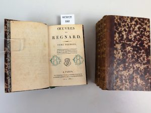 REGNARD , Œuvres , éditions Pierre Didot , Paris , 1801 , in-16 5 tomes. Demi reliure cuir , premier plat papier marbré , les mors du tome 2 sont légèrement frottés. Dos lisse orné de fleurons. ...
