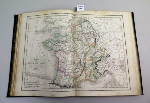 ATLAS. Géographie ancienne du moyen âge et moderne. 1847. In-4. Montage sur onglet, rousseurs et nombreuses annotations sur les cartes, certaines cartes en mauvais état. Couverture poussiéreuse, salie, demi-reliure cuir, couverture moucheté...