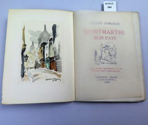Tibor Csernus , Michel Ciry et Fontanarosa , reliure rigide d’éditeur sous rhodoïd , d’après la maquette de Hollenstein , 2728/10250 , dans sa boite , Fils de Montmartre , souvenirs de André Warnod , éditions arthème fayand , 1955 ,Montmartre mon pays de Roland Dorgelès ,n°813/2000 illustré d’une très belle aquarelle et des dessins de Zimmerman, Le masque de fer de Marcel Pagnol, édition de provence , 1965 et Ceux du trimard de Marc Stéphane , édition Grasset , 1928 Demi reliure cuir , dos à nerfs , caissons dorés , très bel ex libris. Ensemble de 6 volumes.
