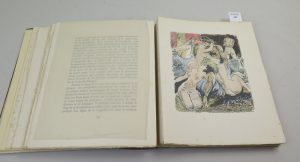 N°105/395 , un des 160 auxquels il a été ajouté une suite des illustrations de M Uzelac et quatre lithographies refusées avec remarques état noir sur amman. Quelques rousseurs , en feuilles sous chemise demi-cuir , premier plat et étui marbrés.