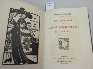 MERIMEE Prosper , Le carrosse du saint sacrement , édition Kieffer , Paris , 1928 , in-8 Tirage à 500 exemplaires sur papier vélin blanc de cuve , celui-ci non numéroté. Cette édition est ornée de dix eaux fortes en couleurs de Touchagues....