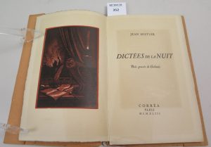 MISTLER Jean , Dictées de la nuit , éditions Corréa , Paris , 1943 Ex n°277/510 , un des 500 sur papier vélin d’arches. Bois gravés de Galanis dont un en frontispice. Couverture souple rempliée ornée d’une vignette représentant une...