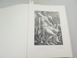 Exemplaire n°14, un des 15 sur vélin d’arches comportant un dessin original correspondant à une illustration hors texte , le bon à tirer signé par l’artiste , deux dessins originaux d’ornement dont un inédit , une suite en noir sur Japon nacré , une suite en sépia sur grand vélin d’arches toutes signées au crayon par l’artiste. En feuilles , sous chemise et étui. Splendide ouvrage d’un très grand graveur. Avec une superbe gravure en hommage à Albrecht Dürer ( le cavalier et la mort).