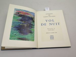SAINT EXUPERY Antoine de , Vol de nuit , édition Rombaldi , in-8 Les bois en couleurs et la typographie ont été imprimés sur les presses de l’imprimerie du compagnonnage. Illustrations en couleurs de Savary gravées sur bois par Guy Descouens....