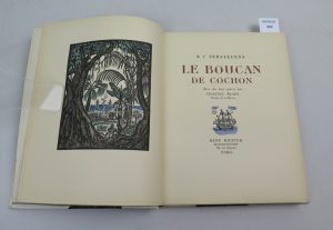 N°229 , un des 450 sur vélin teinté d’un tirage total à 525 exemplaires. Illustrations en bois gravés et coloriés par Gustave Alaux , peintre de la Marine. Reliure demi-cuir à coins parchemin , dos à 4 nerfs , pièce de cuir verte losangée se terminant sur les plats. Titre et auteur dorés , filets dorés et petite mosaïque de cuir représentant un cochon. Couverture souple illustrée conservée. Petite tâche brune au bas du dos de la reliure. Très bel exemplaire intérieur très frais plus d’une cinquantaine de ravissants bois en couleurs.