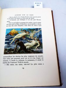 WAGNER Richard , La tétralogie , édition Piazza , Paris , 1942 , in-8 Illustrations d’E.Malassis , tirage non précisé sur vélin. Reliure demi-cuir à coins marron clair , dos à 4 nerfs , pièce de cuir verte mosaïqué de forme losangé se...