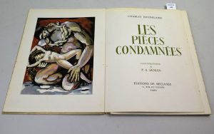 BAUDELAIRE Charles , Les pièces condamnées , éditions de Recloses , Paris , 1947, in-folio Ex n°1748/3000 , nombreuses illustrations en couleur notamment en frontispice par Ekman. Couverture souple rempliée et illustrée , en feuilles , le dos...