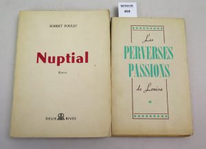 LES PERVERSES PASSIONS DE LOUISA . In-12. Broché , couverture souple , titre en vert. On joint Nuptial de Robert Poulet , éditions des deux rives , in-12 , contient un envoi de l’auteur à Maurice Nadeau joint Femmes du monde de Georget en...