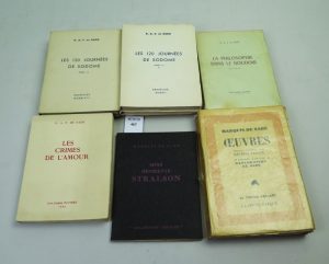 N°614/1250 , Œuvres Maurice Nadeau, Le cheval parlant, La jeune parque, essai Maurice Nadeau, 1947 , contient un envoi de Maurice Nadeau et La philosophie dans le boudoir. 1975. Edition Jean Jacques Pauvert , n° 31/475 , bon état. Ensemble réunissant cinq livres du Marquis de Sade.