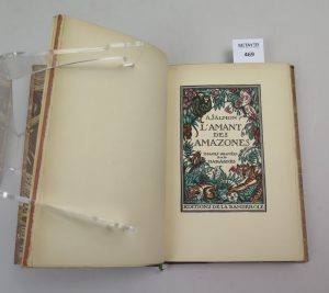 SALMON André , L’amant des amazones , édition de la banderole, Paris , 1921, in-12 Ex n°200/1000 sur papier lafuma , nombreuses illustrations en couleur gravées sur bois par Daragnès. Demi reliure cuir signée par Lavaux , dos orné de...