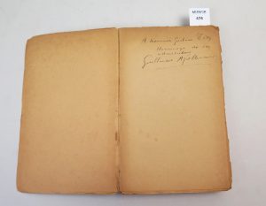 N° 662 sur un tirage non précisé .Contient un envoi de Guillaume Apollinaire. Gravures de Jaudon. Portrait de l’auteur par Picasso. Partiellement non coupé. Broché. Très rare.