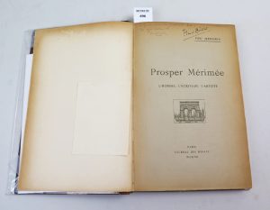 Rare ouvrage tiré à seulement 200 exemplaires celui-ci n°51 nominatif pour Henri Busser sur papier verger d’arches.Cette édition est orné d’une photo de Prosper Mérimée en frontispice. Demi reliure à coin marron, premier plat papier marbré , dos lisse orné de dorure , tranche supérieure dorée , les mors sont légèrement fendus. Exemplaire de la bibliothèque de Henri Busser avec ses initiales dorées sur le premier plat de la reliure , Henri Busser fut un célèbre chef d’orchestre et compositeur.