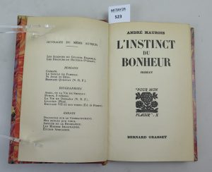 MAUROIS André , L’instinct du bonheur , édition Grasset , Paris , 1934 , in-12 Edition originale n°841/4194 , un des 3350 sur papier alfa. Reliure demi-cuir , plats papier marbré , dos à 4 nerfs , filets dorés sur les nerfs. Bon état. ...