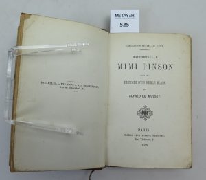 MUSSET Alfred de , Mademoiselle Mimi Pinson , édition Lévy , Paris , 1858 , in-16 Couverture conservée , reliure demi cuir rouge , dos à 5 nerfs , caissons ornés de dorure. Tranche supérieure dorée. ...