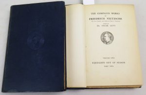 2 volumes. Le tome 1 est le n°348/1000 exemplaires et contient un illustration représentant Nietzsche. Le tome 2 est le n°278/1000 exemplaires. Reliure rigide bleue ornée en son centre d’un portrait de Nietzsche. Edition originale anglaise. Dos insolé.