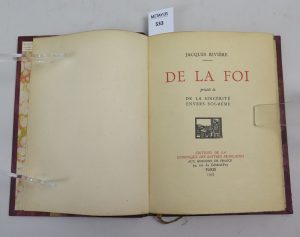 RIVIERE Jacques , De la foi précédé de la sincérité envers soi-même , éditions de la chronique des lettres françaises , Paris , 1927, in-12 Demi cuir bordeaux , papier marbré , tranche supérieure dorée. ...