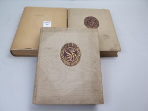 Contribution à l’histoire de la filature des déchets de soie. Reliure rigide tissu blanc. L’un des exemplaires à une jaquette. Quelques rousseurs. Trois fois le même ouvrage.