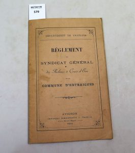 REGLEMENT SYNDICAL GENERAL DES ROBINES ET COURS D’EAU de la commune d’Entraigues , Avignon , Chez J.Chapelle , 1892 Petit étude sur la département du Vaucluse.