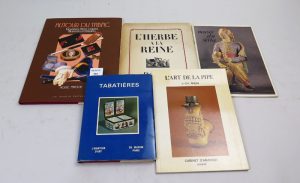 Seita de Edelman , Catalogue. 1979 , Autour du tabac , tabatières , pipes , cigares , allumettes et briquets de Pierre Faveton, édition Charles Massin et l’herbe à la reine dans l’art et dans l’histoire , Edition le service d’exploitation industrielle des tabacs et des allumettes , 1938. Ensemble de 5 livres sur le tabac.