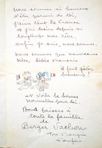 que avant hier ampliation du décret. Nous sommes si heureux d'être parmi de toi, j'aime tant la France et j'ai désiré depuis si longtemps mon rêve. Enfin je suis, nous sommes. Nous sommes que nouveaux nées, bébés français. Il faut gâter beaucoup ! [^j ». Il illustre sa lettre de 3 dessins rehaussés d'aquarelle : un œuf de Pâques surmonté d'un coq, un double drapeau français et un autoportrait main dans la main avec Kimiyo un drapeau tricolore dans la main.