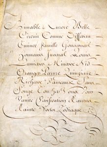 Calligraphie. 4 documents, fin xviiie-début xixe - Abécédaire du XVIIIe. Sur une feuille de parchemin (32 x 24 cm), composition calligraphique sous forme d'abécédaire. - Cahier grand in-folio (50 x 34 cm) de 20 feuillets de papier fort. Juin...