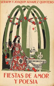 1910. (RUSTICA ILUSTRADA). ALVAREZ QUINTERO, SERAFIN Y JOAQUIN: FIESTAS DE AMOR Y POESIA. Barcelona: Ed. Manuel Marín, s.a. 8º. 128 p. fileteadas en rojo. Enc. en media piel con faltas en el lomo. Conserva la rústica original ilustrada por Triadó.