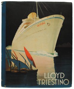 1935. (NAVEGACION). LLOYD TRIESTINO. Folleto publicitario de los buque de la compañia Lloyd Triestino. Abund. fotografías de los salones y cabinas de primera clase. Rústica litográfica en color.