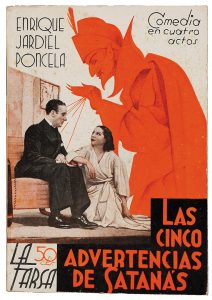 1935. (RUSTICA ILUSTRADA-TEATRO). JARDIEL PONCELA, ENRIQUE: LAS CINCO ADVERTENCIAS DE SATANAS. COMEDIA EN CUATRO ACTOS Y EN PROSA. Dibujos de Agustin Segura. Madrid: La Farsa, 1935. 8º menor. 112 p. Rústica ilustrada.