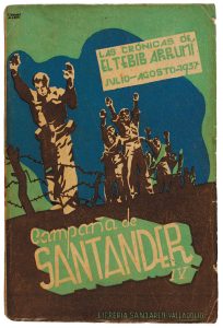 1938. (RUSTICA ILUSTRADA-GUERRA CIVIL). TEBIB ARRUMI: CAMPAÑA DE SANTANDER. (JULIO-AGOSTO-1937). LAS CRONICAS DE EL TEBIB ARRUMI IV. Valladolid: Libr. Santarén, 1938. 8º mayor. 174 p., 4 h. Rústica ilustr. por Fernando Marco.