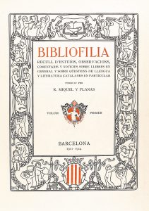 4º mayor. I. Años 1911-1914: 2 h. + 692 col., 9 h.; II. Años 1915-1920: 2 h. + 645 col. Obra profusamente ilustr., con abundates láms. Enc. en tela decorada, lomo en piel, cortes jaspeados. Palau 171351. ´Publicación espléndida, y sin disputa la más notable en este género salida de las prensas catalanas. El tomo primero comprende los textos antiguos e inéditos de Escachs d´amor, por Castellvi, Vinyoles y Fenollar; y Llibre de Fra Bernat por Francesch de la Vila. El tomo segundo, Cançoner devot, por Miquel Ortigues; y Ordinacions de la Confraria del honrats Canayrins, romance satírico del siglo XVI. Contiene, además, entre otros estudios originales del autor unas cartas que no se publicaron por separado, la versión catalana de los estudios sobre encuadernación mudéjar y catalana, sobre la Gramática de Mates, las Confidencias y Pensamientos de ´Juan Bonhome´ y la Novela de un Bibliofilo si bien éste con el titulo de su forma, o sea, Dialechs.´ Estos dos volúmenes consituyen la mejor expresión bibliográfica y filológica del noucentismo barcelonés.