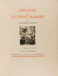 1921. (BIBLIOFILIA). FRANCE, ANATOLE: JOCASTE & LE CHAT MAIGRE. Paris: Ed. La Banderola, 1921. 4º. 3 h., 222 p., 2 h. Ilustr. con grabados a la punta seca de Chas Laborde en cabeceras y cules-de-lampe y dos lám. fuera del texto. Rústica, con las...