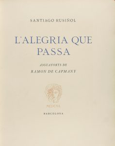 1947. (BIBLIOFILIA). RUSIÑOL, SANTIAGO; CAPMANY [ilustrador]: L´ALEGRIA QUE PASSA. Sabadell: Joan Sallent, 1947. 4º. 114 p. Impreso a dos tintas sobre papel de hilo de gran calidad, con barbas. Magníficamente ilustrado con 17 aguafuertes...
