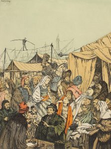 1960. (BIBLIOFILIA). BARCA, CALDERON DE LA: EL GRAN MERCADO DEL MUNDO. Ilustr. al aguafuerte de Ramon de CAPMANY. Barcelona: Hora Luen, 1960. Folio. 133 p. Ilustr. con 12 grabados entre viñetas y láms. a plena página, aguafuertes a color de...