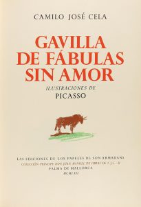 1962. (BIBLIOFILIA). CELA, CAMILO JOSE; PICASSO, PABLO: GAVILLA DE FABULAS SIN AMOR. Palma de Mallorca: Las Ediciones de los Papeles de son Armadans, Colección Principe Don Juan Manuel de Obras de C.J.C.-II, 1962. Folio mayor. 157 p., 3 h., 3 h....