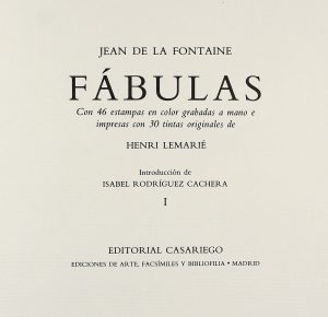 1991. (BIBLIOFILIA). FONTAINE, JEAN DE LA; LEMARIE, HENRIE: FABULAS. Con 46 estampas en color grabadas a mano e impresas en 30 tintas originales de Henri Lemarié. Intr. Isabel Rodriguez Cachera. Madrid: Ed. Casariego, 1991. 2 vols. en 8º apaisado....