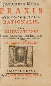 1695. (MEDICINA). MUYS, JOHANNIS: PRAXIS MEDICO-CHIRURGICA RATIONALIS, SEU OBSERVATIONES MEDICO-CHIRURGICAE SECUNDUM SOLIDA VERAE PHILOSOPHIAE FUNDAMENTA RESOLUTAE. Amstelaedam [Amsterdam]: Imp. Joannem Wolters, 1695. 8º menor. Portada con grabado...