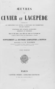 1880 ca. BUFFON: OEUVRES DE CUVIER ET LACEPEDE CONTENANT LE COMPLEMENT DE BUFFON A L´HISTOIRE DES MAMMIFERES ET DES OISEAUX. L´HISTOIRE DES CETACES, BATRACIENS, SERPENTS ET POISSONS. Annotées par M. Flourens, s.a. 4º. 668 p. Ilustr. con 9 lams....