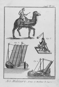 i d´Alambert. Incluye: Armas y máquinas de guerra; Táctica de los griegos; Táctica de los romanos; Fortificación antigua; Milicia, fortificación y máquinas de los turcos; Nueva artilleria; Fabrica de armas, fusil municion; Picas y fusil-pica; Evolucion de la infanteria; Evolucion de la caballeria; Fortificaciones.