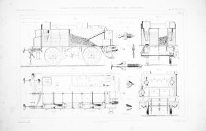 1850 ca. (FERROCARRILES). ARMENGAUD [grabados]; CHAUMONT [dibujó]: 4 GRABADOS DE MAQUINAS A VAPOR DE FERROCARRILES. Paris: Imp. Chardon, s.a. Grabados al cobre. 30 x 45 cm. Pequeñas manchas de óxido.