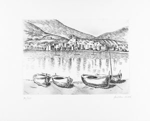 ca. 1950. (ARTE). 4 AGUAFUERTES ORIGINALES y 1 LITOGRAFÍA, TRES DE J. PAGANS MONSALVATJE, UNO DE GUILLEM VILLÀ Y LITOGRAFÍA DE FRANCESC TODÓ. Papel 28 x 53 cm, y plancha 25 x 18 cm. Todos firmados y numerados por el artista.
